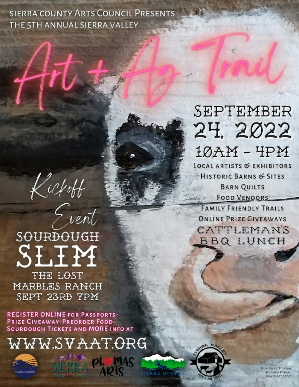 SIERRA VALLEY - After a two year hiatus, the intersection of culture, history, farming and artisan crafts collide on Saturday, September 24 from 10 a.m. to 4 p.m. for the 5th annual Sierra Valley Art + Ag Trail (SVAAT), presented by the Sierra County Arts Council with support from the Sierra Nevada Conservancy and Plumas Arts. Event organizers aim to highlight the sustainable ranching practices, local history, nature conservancy and local artisans for a day of exploration, education, and fun for all ages. This free event encompasses the Sierra Valley, the largest alpine valley in California, with over 100 miles of self-guided exploration through pristine vistas and historic ranches. For $25, guests can purchase a commemorative Passport containing images taken by local photographers online or at one of our four trailheads – pass includes a place to stamp and track your progress, a map with the location and history of the 11 event sites as well as the locations of ADA restrooms, barn quilts and food stops throughout the Sierra Valley. Guests who reserve their Passport in advance earn two free entries to the prize drawing. The event is also free for the local exhibitors. In return, the exhibitors donate a piece of their work to the incredible Art + Ag Trail prize drawing taking place at 12 p.m. on September 24, the event day. Prize baskets will be on display and available to pick up at the Loyalton Trailhead. Winning entrants will be notified by email. Visitors can purchase prize entries in advance online or at one of our four trailheads. SVAAT highlights include barn quilts, market farms, working ranch tours, historic buildings and local artisan crafts of every medium – wood, paint, glass, ceramic, metal and fiber among others. Additionally, the Art & Ag Trail offers kid-friendly interactive activities including branding, roping, a petting zoo, textile demonstrations, education on food, fiber and urban gardening, a Cattlemen’s lunch, fresh local pies sold by the Grange and much more. This year, there will be a new kickoff event featuring Sourdough Slim on the evening of Friday, September 23. All are welcome to purchase tickets online at https://sierravalleyartagtrail.org/ for dinner and a concert at the Lost Marbles Ranch. Organizers invite all to enjoy BBQ pulled pork sandwiches and rotisserie chicken dinner from When Pigs Fly catering, throw back a cold one from the incredible Cattlewomen’s cash bar, then “kick back for a hooting and hollering performance of the legendary Sourdough Slim!” The ‘When Pigs Fly BBQ’ will be held from 5:30 to 7 p.m. and Sourdough Slim will be in concert from 7 to 9 p.m. There is limited seating available, so please be sure to book online soon. A limited amount of first come, first serve tickets will also be at the door. The Lost Marbles Ranch is located at 2985 Marble Hot Springs Road in Beckwourth. “We are strongly encouraging purchasing your passport online ahead of the event, along with online donations and raffles,” McIntosh explained. “The funds raised during this event will be going towards scholarships for art and agriculture students specifically, once the cost of the event is covered. We are excited to give back to the community in this way.” Sierra Valley is a stunning alpine valley the size of Lake Tahoe nestled between the Sierra Nevada, the Cascade Range and the Great Basin. The valley is home to many historic cattle ranches, beautiful old dairy barns, market farms and talented artisans. Located at the headwaters of the wild and scenic middle fork of the Feather River, the valley’s freshwater marshes, grass meadows and sage steppes provide varied habitats that support an array of wildlife, including growing herds of pronghorn antelope, mule deer and the occasional elk. It is also a nationally designated Important Bird Area with over 260 bird species visiting during the year. About the Sierra Valley Art + Ag Trail The event was developed through the cooperative efforts of residents, local organizations, sponsors, funders and many individual artists and family-owned farms and ranches. The Sierra Valley Art + Ag Trail is an event of the Sierra County Arts Council. Visit SierraValleyArtAgTrail.org for more information.