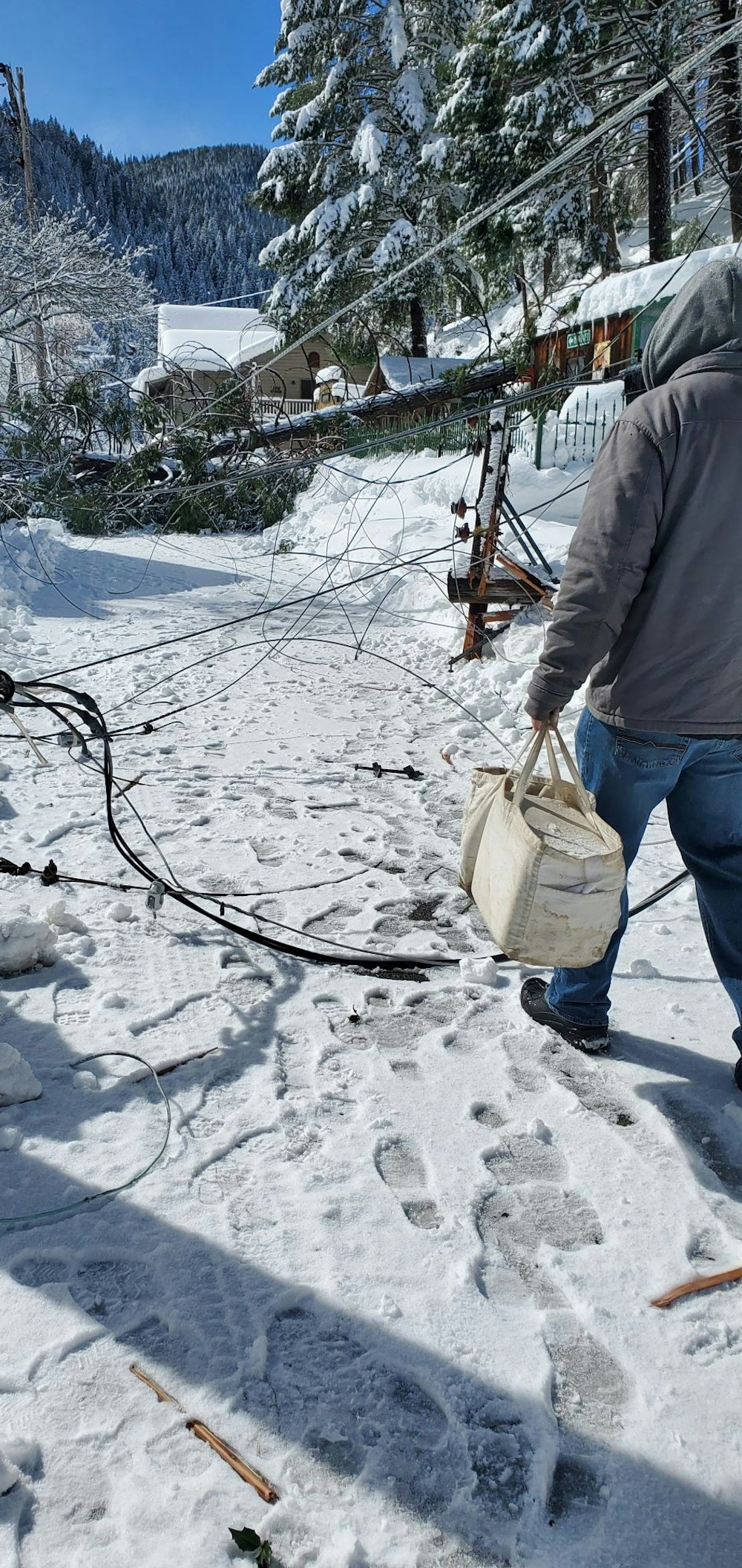 This photo, taken late on Tuesday morning, 3/1, shows a Caltrans snowplow operator walking west on Downieville's Main St. on his way to crawling through a downed cedar tree before starting another 12-hour shift.