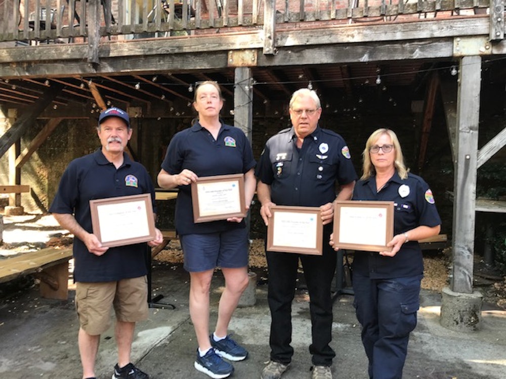 While the above-pictured individuals do not consider themselves “heroes”, residents of Sierra City, Downieville, and the surrounding areas certainly do! At the “ready” to respond to medical emergency and fire calls, they volunteer to save lives and property thus keeping our communities safer and residents feeling more secure. On Wednesday, September 8th, members of Sierra City’s Harmony Lodge, #164, Free and Accepted Masons, held a luncheon, on Sabrina’s Patio at the Forks, to honor these four individuals for their service as members of the Sierra City and Downieville Volunteer Fire Departments. Lodge Master, Shaun Metroka introduced the following individuals: Sierra City Fire Chief, Scott Hall, who presented the awards to Sarah Kubley and Steve Traverso, followed by Downieville’s Senior Fire Captain, Robert Hall, who honored Stephen Folsom and Dianne Wharff. Both presenters noted that these individuals serve their departments in other capacities, as well, and are invaluable to the operation of each department, often working together to give needed assistance to area residents. The Masons began this tradition in 2018; however, due to COVID, the event was suspended for a couple of years. What a great way to recognize those individuals who serve our communities with their time and talents and what a privilege to have these volunteers, along with their peers, willing to respond as soon as they hear “the call”! Left to Right: Steve Traverso, Sarah Kubley, Steve Folsom, and Dianne Wharff displaying the framed awards they received from Sierra City's Masons.