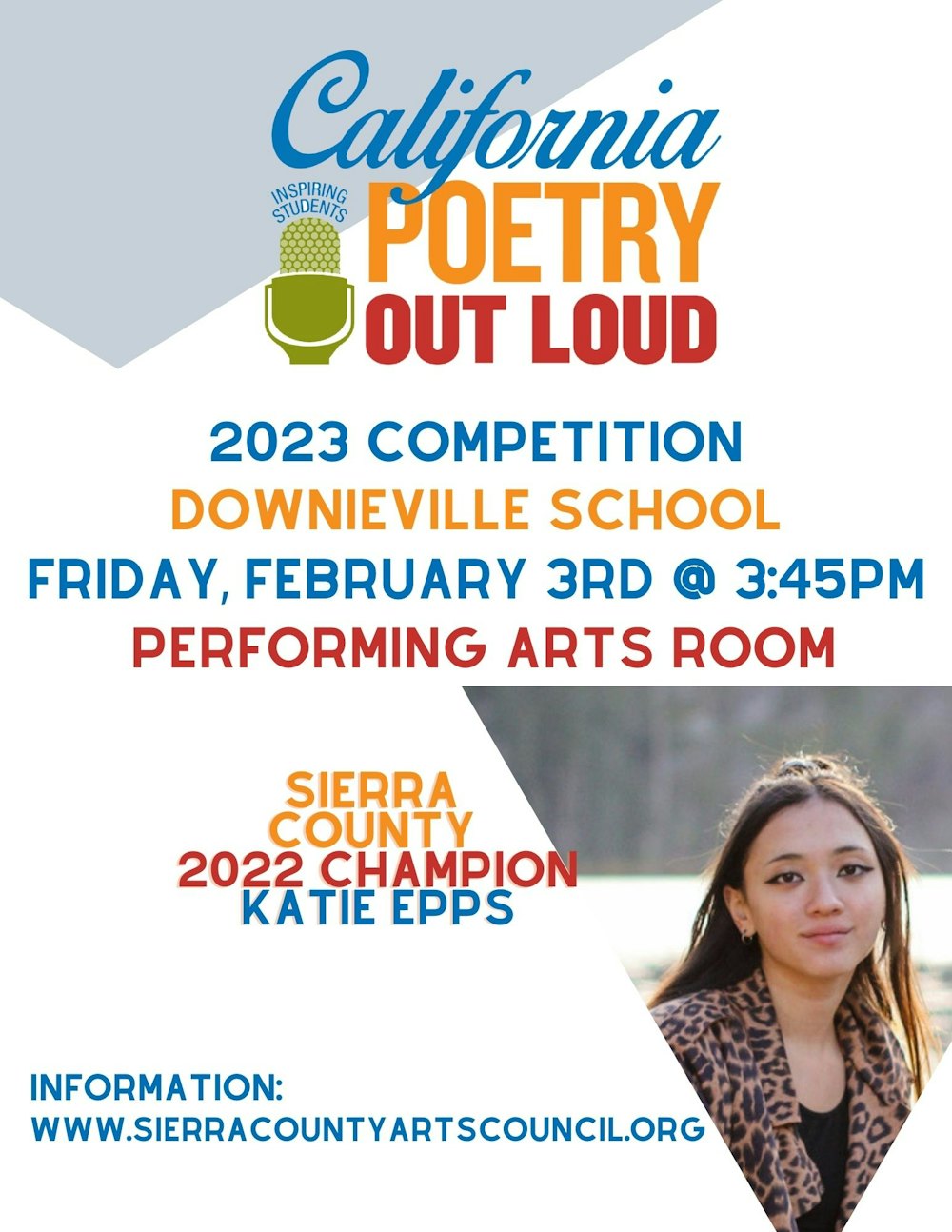 The fifth annual Poetry Out Loud County Finals will be held on Friday, February 3, at 3:45 p.m., in the drama room of Downieville High School. The public is invited and welcome!Poetry Out Loud is an initiative of the National Endowment of the Arts, sponsored in California by the California Arts Council, and in Sierra County by the Sierra County Arts Council, under the executive directorship of B.J. Jordan. Even though this is only the fifth year that Sierra County has participated in the program, it has been in existence nation- and state-wide since 2005.Poetry Out Loud is a program of poetry memorization and recitation for high school students. Participants in the County Finals will each recite two poems, selected from an online anthology of more than 1,100 poems on the national Poetry Out Loud website (poetryoutloud.org). They will be judged on physical presence, voice and articulation, dramatic appropriateness, evidence of understanding, overall performance, and accuracy.The county