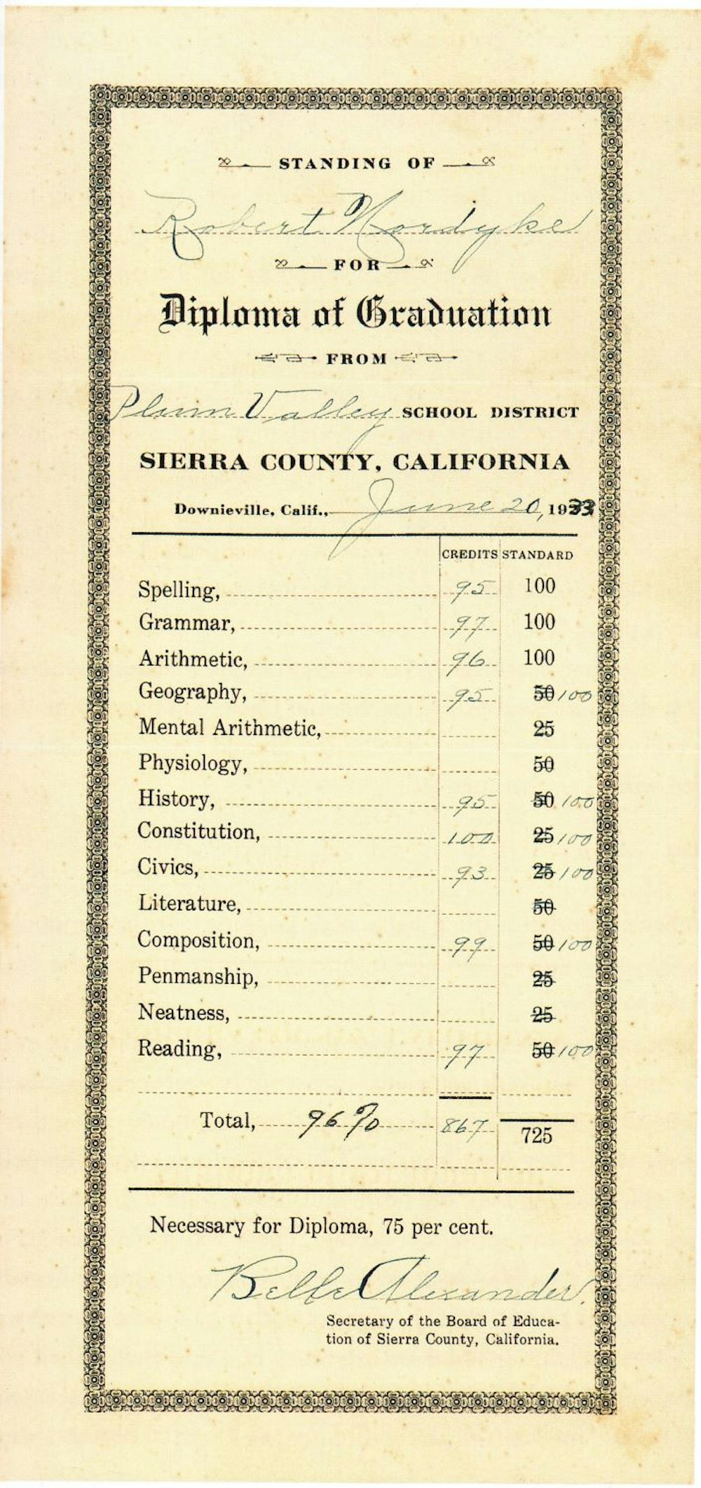 at the other end and comes out on Ridge Road near Plum Valley. Bob Nordyke graduated from the Pike City School in 1933. His diploma was issued by the Plum Valley School District. What other schools were in the district? About the author: As a kid in 1975, Rae Bell moved with her family to the Mott Cabin at the Ruby Mine located between Alleghany and Downieville. She and her husband have lived in Alleghany proper since 1992. If you have news or suggestions to share, please send an email to: raebell44@gmail.com