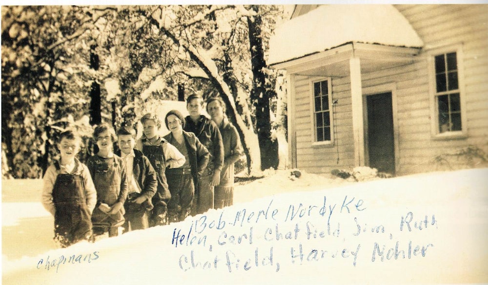 Students pictured outside the Pike City Schoolhouse in the 1930s, left
