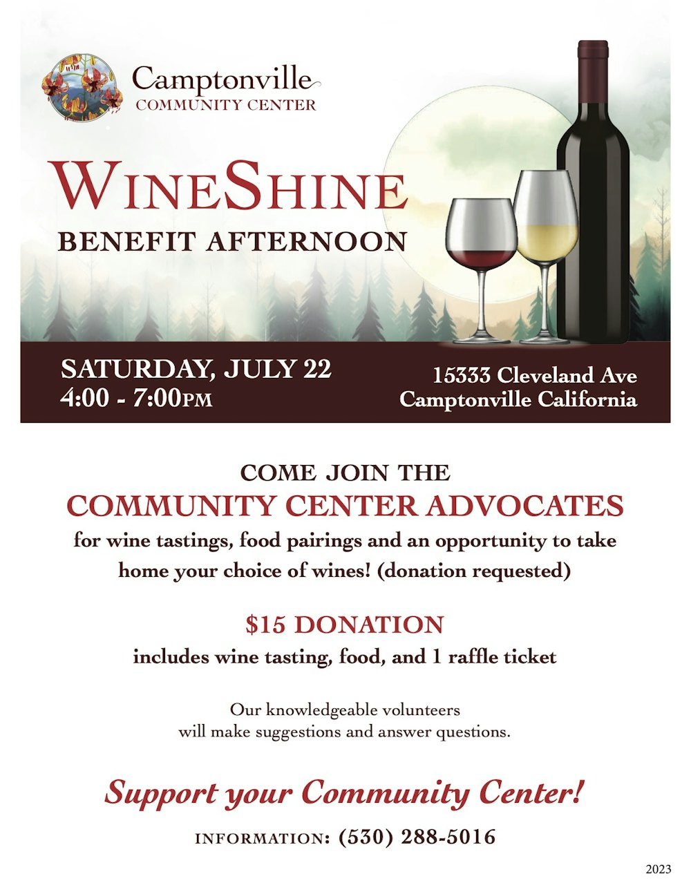 Press Release by Camptonville Community Center Featuring an amazing variety of wines from the Sunset International Wine Competition A beautiful summer afternoon…wines for tasting and taking home…delicious paired appetizers and palate cleansers… On Saturday July 22, from 4 to 7 pm, come join the Camptonville Community Center Advocates for the first ever WineShine benefit event! A $15 donation includes wine tasting, food, and one raffle ticket. The event features an amazing variety of wines, from the highly affordable to the highly sophisticated, coming from the Sunset International Wine Competition 2023. The wine will be de-coded